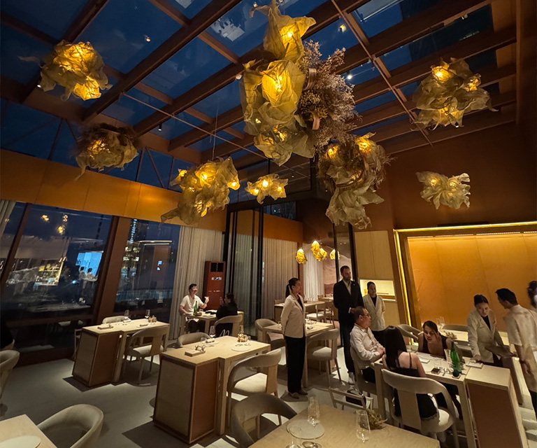 Service is unusually thoughtful. Every table has its own built-in service cabinet, sacrificing valuable floor space for guest comfort. Even the smallest touches stand out — as individual phone stands with tiny LED lights so guests can photograph their dishes with ease. It’s a detail that says: we know how people dine today, and we’re here to make it effortless.