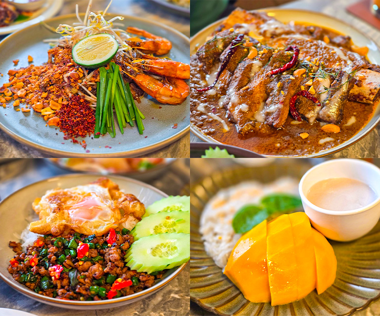 Classic Thai staples follow with flair. The Pad Krapao is fiery and aromatic, while the Phat Thai Goong balances sweet, sour, and savory with that unmistakable wok-kissed depth.